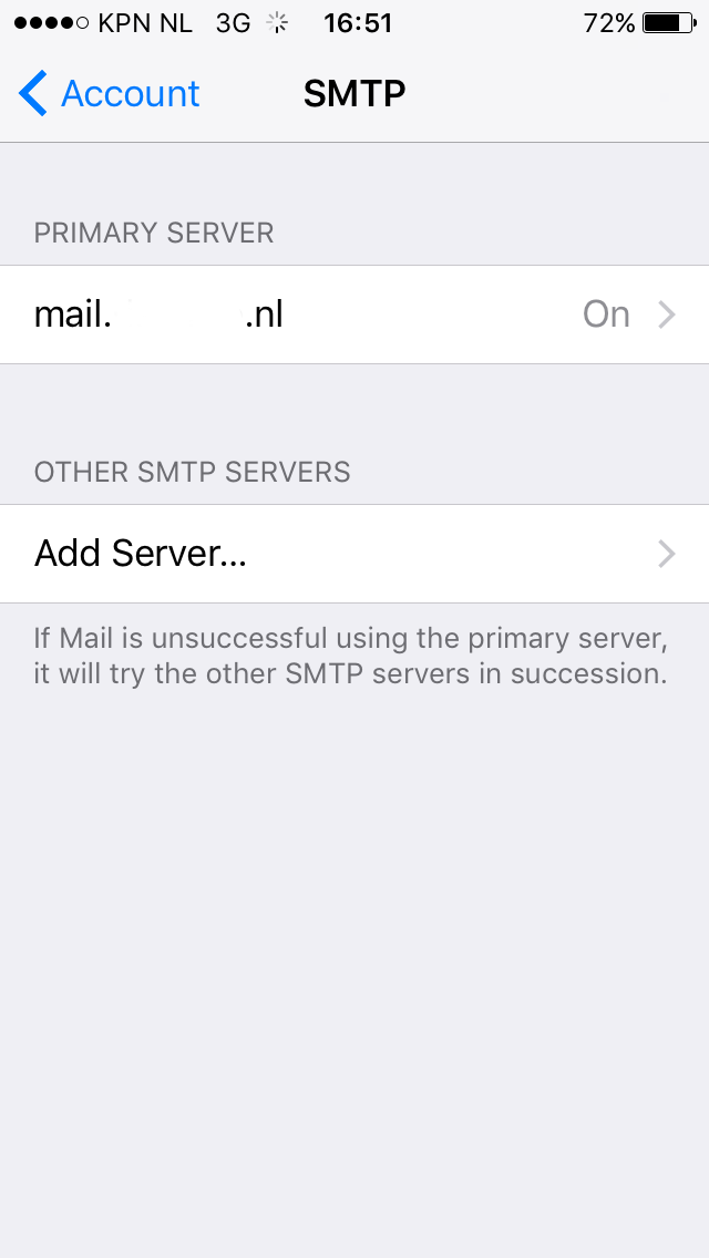 In het nieuwe scherm (4) scrol je naar beneden tot dat je de uitgaande mail server ziet staan. Deze is aangegeven met SMTP, klik hierop. In het volgende scherm (5) klik je op de primaire server die in gebruik is.
